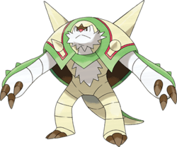 Der Pflanzenstarter ist genau wie in der dritten Generation ein Reptil. Diesmal eine süße Schildkröte mit einem Blatt auf dem Kopf. Als Chelcarain entwickelt es sich eher in die Dinosaurier-Richtung mit Bewuchs auf dem gepanzerten Rücken. Als Chelterrar wird diese Idee vervollständigt indem der Panzer massiver wird und von einem kompletten Baum gekrönt ist. Das Design ist geradlinig und bietet wenig Überraschungen. 4 von 5 Punkten
