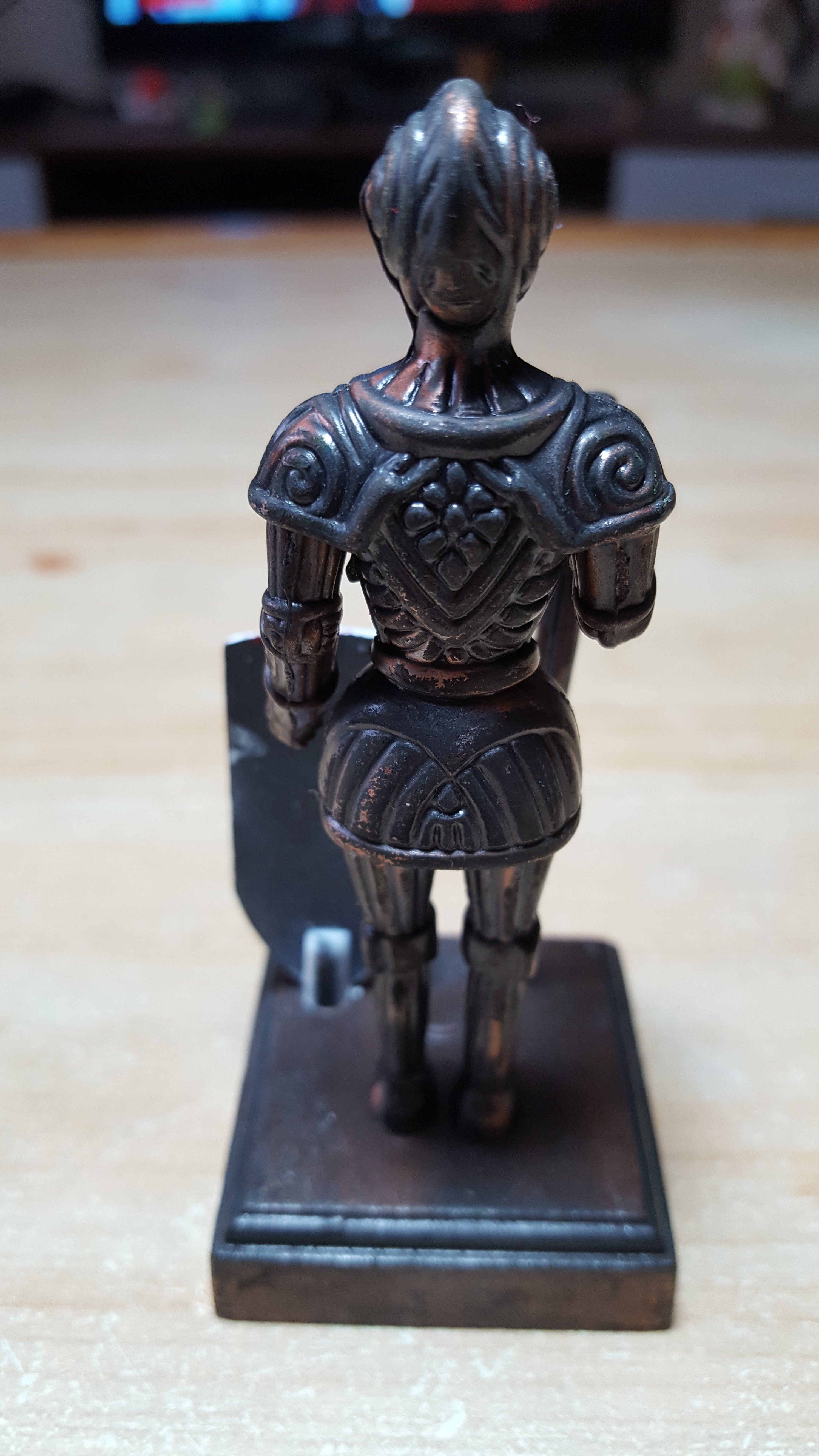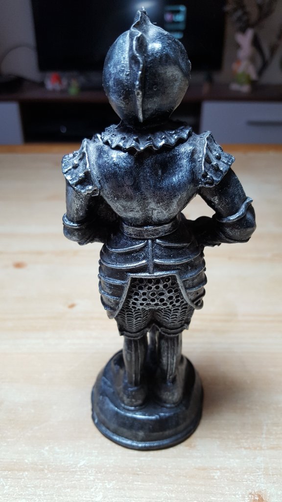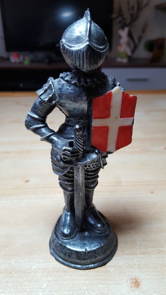 Bei den heutigen Exponaten handelt es sich um Ritter von der Insel Malta. Der Orden der Malteser ging aus dem Johanniterorden hervor. Ab 1530 war der Orden auf der Insel Malta ansässig, die zwischenzeitlich einen der größten christlichen Sklavenmärkte der Neuzeit beherbergte. 1798 wurde der Orden aus Malta vertrieben. Die immer noch vorhandene Festung der Malteser ist heutzutage eine Touristenattraktion und Souvenirs dieser Art erhält man dort an jeder Ecke. Der große Ritter ist ein Andenken aus einer Maltareise meiner Jugend und der kleine ist ein Erbstück. Sie haben in der Schrankwand im Arbeitszimmer Posten bezogen.