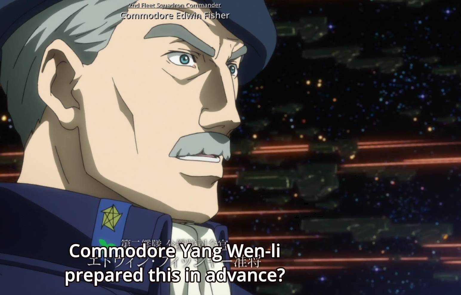 Aber das Schicksal nimmt eine andere Wendung. Die 4te und 6te Flotte werden nacheinander von den Kaiserlichen unter Reinhard aufgerieben. Auch für die 2te Flotte sieht es nicht positiv aus. Die Brücke der Patoroklos wird getroffen und Paetta wird schwer verletzt. Yang übernimmt jetzt die Kontrolle. Und hier werden wir Zeuge von Yangs absolutem Genius. Es war ihm möglich die Taktik des Gegners im Voraus zu antizipieren und hat taktische Anweisungen im Vorfeld der eigentlichen Schlacht per Data-Link an die gesamte Flotte verteilt. In dem Moment wo Reinhards Flotte durch das Zentrum brechen will, gibt er Anweisung an die Flotte die taktische Einstellung C4 auszuführen. Die Kommunikation während des Kampfes ist durch den massiven Störsendereinsatz nur schwer möglich. Aber durch Yangs Voraussicht musste nur eine kurze Mitteilung zum Einsatz über den allgemeinen Funk erfolgen. Dadurch sind Yangs Untergebene in der Lage seinen Plan auszuführen, ohne das die Kaiserlichen der inhaltlichen Details gewahr werden. Yangs Flotte teilt sich absichtlich in zwei kleinere Geschwader, welche mit voller Geschwindigkeit an den durchbrechenden Kaiserlichen vorbeifliegen um sich dann durch ein enges Wendemanöver hinter der Formation von Reinhards Flotte zu positionieren. Dieser ist zwar kurz überrascht aber reagiert geschwind mit einem engen Wendemanöver seinerseits. Dies führt zu einer Formation, die zwei Schlangen ähnelt, welche den Schwanz der jeweils anderen fressen. Von dieser Situation frustriert tritt Reinhard den Rückzug an. Yang nutzt diesen Moment ebenso dazu sich aus dem Kampf zu entfernen und die Überlebenden der 4ten und 6ten Flotte einzusammeln. Am Ende gehen beide als Sieger hervor. Reinhard gelang es eine massivst überlegene feindliche Streitmacht zu einem Unentschieden zu treiben, während Yang die komplette Vernichtung der FPA Flotte abwenden konnte.